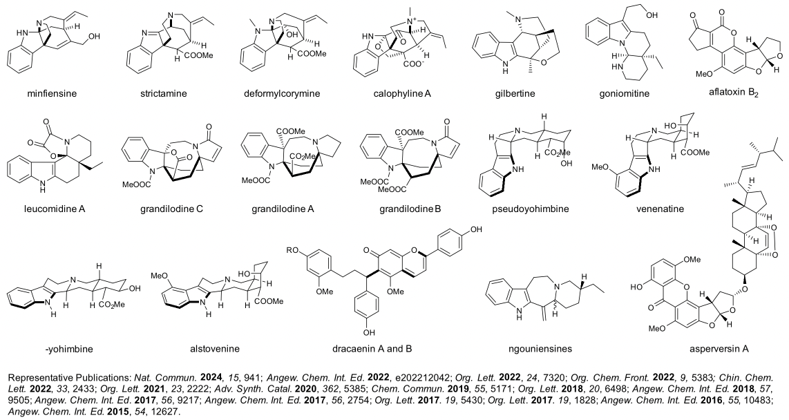 自2012年加入清華大學(xué)藥學(xué)院獨(dú)立工作以來,我們課題組緊密圍繞復(fù)雜天然產(chǎn)物的化學(xué)合成與藥物化學(xué)開展研究工作,結(jié)合方法驅(qū)動(dòng)與活性導(dǎo)向的研究模式,完成了一系列復(fù)雜天然產(chǎn)物的化學(xué)合成,其中deformylcorymine, calophyline A, leucomidine A, grandilodine B, dracaenin A/B, asperversin A等均系首次化學(xué)全合成,gilbertine, goniomitine, b-yohimbine, pesudoyohimbine, alstovenine, venenatine, ngouniensines, aflatoxin B2等分子均系迄今最簡潔合成。此外,我們還對(duì)一些合成的天然產(chǎn)物開展了生物活性研究,發(fā)現(xiàn)了具有抑制抗生素耐藥性、止血、減少淀粉樣蛋白生成等功能的新型化學(xué)分子。課題組在領(lǐng)域內(nèi)一流期刊累計(jì)發(fā)表通訊作者論文30多篇,授權(quán)專利4項(xiàng)。