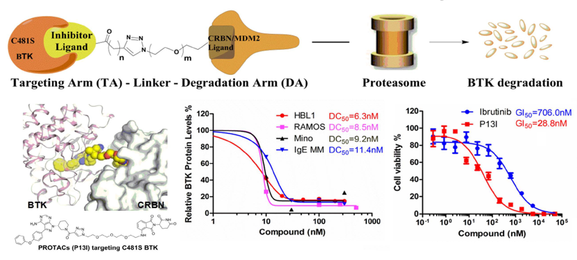 4)開發(fā)小分子蛋白質(zhì)靶向降解技術(shù)(PROTACs)克服Ibrutinib耐藥的B細(xì)胞惡性腫瘤。非霍奇金淋巴瘤(NHL)是B細(xì)胞惡性腫瘤的一種, 2015年引起全球約23萬人死亡,僅美國每年新增病例6萬余人。自從2013年被FDA批準(zhǔn),BTK共價抑制劑Ibrutinib一直是治療多種非霍奇金淋巴瘤的一線用藥,包括套細(xì)胞淋巴瘤、慢性淋巴細(xì)胞白血病、華氏巨球蛋白血癥。盡管如此,根據(jù)最新的臨床數(shù)據(jù)報道,針對Ibrutinib已經(jīng)出現(xiàn)了嚴(yán)重的耐藥性。由于BTK蛋白481位半胱氨酸突變?yōu)榻z氨酸(C481S),使得Ibrutinib的活性下降近500倍,臨床數(shù)據(jù)已經(jīng)證明這一突變是病人產(chǎn)生對Ibrutinib耐藥的根本原因。本課題組通過構(gòu)建新型小分子靶向蛋白降解劑,招募E3泛素化連接酶靶向降解BTK蛋白。新構(gòu)建的BTK蛋白降解劑可以在多種B細(xì)胞惡性腫瘤中高效降解BTK蛋白。小分子蛋白降解劑對BTK依賴的野生型人B細(xì)胞淋巴瘤(HBL-1)細(xì)胞的抑制活性與臨床一線用藥Ibrutinib相當(dāng)。更為重要的是,新策略可以靶向降解C481S突變的BTK蛋白,克服B細(xì)胞惡性腫瘤BTK激酶由于C481S突變引起的對臨床一線藥物Ibrutinib的耐藥性(圖一)。該工作為基于蛋白質(zhì)降解技術(shù)進(jìn)行抗耐藥B細(xì)胞惡性腫瘤的藥物研發(fā)提供了重要信息。( 代表性工作:Cell Research,2018, 22. 779–781; Leukemia, 2019, 33, DOI: 10.1038/s41375-019-0440-x.)。