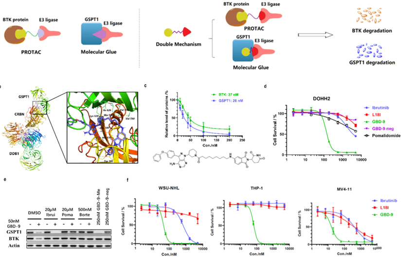 2) 開發(fā)雙靶雙機(jī)制小分子降解劑。靶向蛋白降解是以泛素-蛋白酶體系統(tǒng)為基礎(chǔ),用小分子降解劑誘導(dǎo)靶蛋白降解的一種技術(shù),其中最主要的兩種降解機(jī)制包括PROTAC和分子膠。PROTAC分子由三部分組成,PROTAC分子可將靶蛋白錨定到E3泛素連接酶進(jìn)而誘導(dǎo)其泛素化降解。與PROTAC類似,分子膠是單一的小分子片段,分子量較小,它通過誘導(dǎo)靶蛋白與E3泛素連接酶之間形成較為緊密的蛋白-蛋白相互作用來實現(xiàn)泛素化降解。這兩種蛋白降解技術(shù)各有優(yōu)缺點,例如PROTAC適于理性設(shè)計,但由于分子量偏大,導(dǎo)致成藥性不足。分子膠分子量小,成藥性好,且能降解難成藥靶點,可以彌補(bǔ)PROTAC的不足,但由于需要在兩個蛋白之間誘導(dǎo)形成一個結(jié)合口袋,設(shè)計難度大。如何平衡二者的優(yōu)劣之處使靶向降解技術(shù)得到進(jìn)一步發(fā)展是一個重要的問題。為打破現(xiàn)有技術(shù)的桎梏,本課題組在此工作中首次提出了將PROTAC分子與分子膠相融合的概念。根據(jù)PROTAC和分子膠的特點設(shè)計合成了一系列雙靶、雙機(jī)制的降解劑,這類新型降解劑既保留了降解BTK的PROTAC活性,又兼具降解GSPT1的分子膠特點,以PROTAC的思路設(shè)計合成雙機(jī)制降解劑解決了分子膠設(shè)計難度大的問題,而作為分子膠降解GSPT1也補(bǔ)充了PROTAC在生物活性上的不足,對難治性腫瘤的臨床治療具有潛在重要意義。該雙機(jī)制降解劑開發(fā)也為靶向降解技術(shù)的發(fā)展開拓了新的思路。( 代表性工作:Cell Research, 2021, 25, 1315-1318. DOI: 10.1038/s41422-021-00533-6.)。