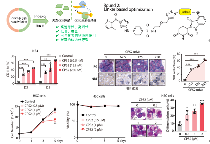 3) 靶向CDK2誘導(dǎo)AML分化的PROTAC小分子探針研究。AML是一種常見的血液癌癥,該病以骨髓與外周血中原始和幼稚髓性細(xì)胞異常增生為主要特征。該疾病以蒽環(huán)類和胞苷藥物聯(lián)合化療為主要臨床治療方案。該治療方案一定程度上是有效的,但也存在嚴(yán)重的毒副作用,5年復(fù)發(fā)率高達(dá)70%。近期研究表明CDK2是一個潛在的分化治療靶點。但是,由于CDK蛋白的高度同源性及ATP結(jié)合口袋的相似性,傳統(tǒng)小分子抑制劑難以實現(xiàn)高選擇性。傳統(tǒng)激酶抑制劑通過多靶點協(xié)同抑制發(fā)揮功能,存在嚴(yán)重毒性,臨床治療和科研中尚無CDK2選擇性的抑制劑。本課題組通過構(gòu)建新型小分子靶向CDK2蛋白高效降解劑,從分化治療角度為急性髓系白血病(AML)治療提供了一種可能的治療手段。代表性的CDK2蛋白降解劑CPS2可以在多種AML細(xì)胞系中以小于10 nM的DC50高效選擇性降解CDK2蛋白。區(qū)別于傳統(tǒng)小分子抑制劑,CPS2可顯著抑制細(xì)胞增殖,且不會引起顯著的細(xì)胞凋亡。該分子在體內(nèi)外實驗中均體現(xiàn)出了良好的安全性,且對HSCs的生存無顯著性影響。更為重要的是,代表性化合物CPS2可引起AML細(xì)胞的分化,該分化指標(biāo)可通過細(xì)胞形態(tài)、細(xì)胞染色和表面標(biāo)記物等多個維度進(jìn)行監(jiān)測,這為AML的治療提供一種新的分化治療的先導(dǎo)化合物。該工作基于蛋白質(zhì)降解技術(shù)解決了長期以來的靶向CDK2的選擇性難題,提供了一種可行的AML分化治療先導(dǎo)化合物。除AML治療外,該類降解劑或可在CDK2相關(guān)的其它疾病治療領(lǐng)域也發(fā)揮重要功能。( 代表性工作:Nature Chemical Biology, 2021, 16, 567-575. DOI: 10.1038/s41589-021-00742-5.)。