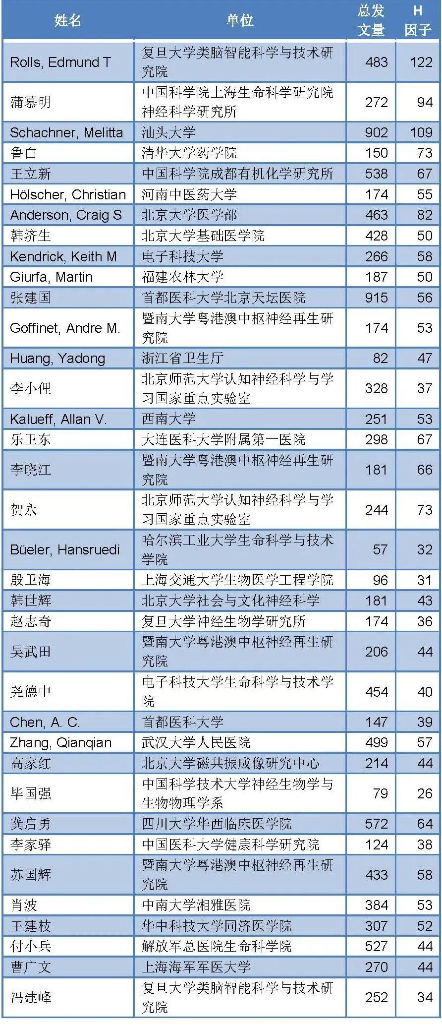 中國區(qū)神經(jīng)科學(xué)領(lǐng)域入選全球前2%頂尖科學(xué)家“生涯影響力”榜單