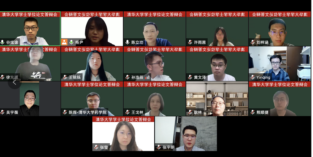 2022年6月8日,清華大學藥學院2022屆學士學位論文答辯會順利開展。在嚴格遵守疫情防控政策要求下,此次答辯會采用線上答辯的方式開展,根據(jù)學生研究課題的專業(yè)方向分組同時進行。清華大學藥學院陳立功副教授、李寅青副教授、劉清飛副教授、張瑩助理研究員,清華大學衛(wèi)建學院李志徽助理教授,以及各導師課題組博后代表受邀作為答辯評審專家出席本次答辯會。