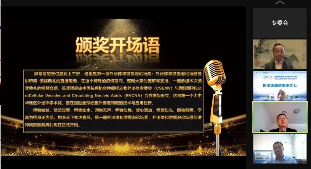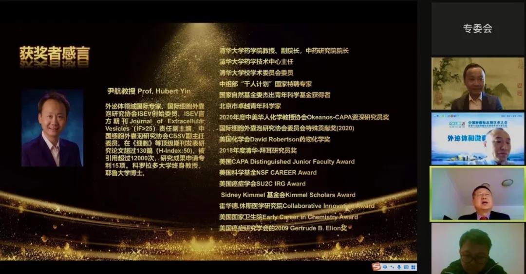 Extracellular Vesicles and Circulating Nucleic Acids(EVCNA)聯(lián)合發(fā)起設(shè)立第一屆外泌體和微囊泡論壇獎:CSEMV & EVCNA Lectureship Award-2021(外泌體和微囊泡論壇講座獎)。這是國內(nèi)的首個(gè)外泌體研究領(lǐng)域的獎項(xiàng),該獎項(xiàng)的設(shè)立旨在鼓勵全球細(xì)胞外囊泡領(lǐng)域的技術(shù)與應(yīng)用的創(chuàng)新,每年授予一名在外泌體領(lǐng)域取得突出貢獻(xiàn)的資深研究人員。本次線上頒獎儀式由澳大利亞新南威爾士大學(xué)李勇教授主持, CSEMV主席張灝教授代表協(xié)會頒獎, EVCNA主編美國國立衛(wèi)生院資深研究員Yoke Peng Loh博士致辭。
