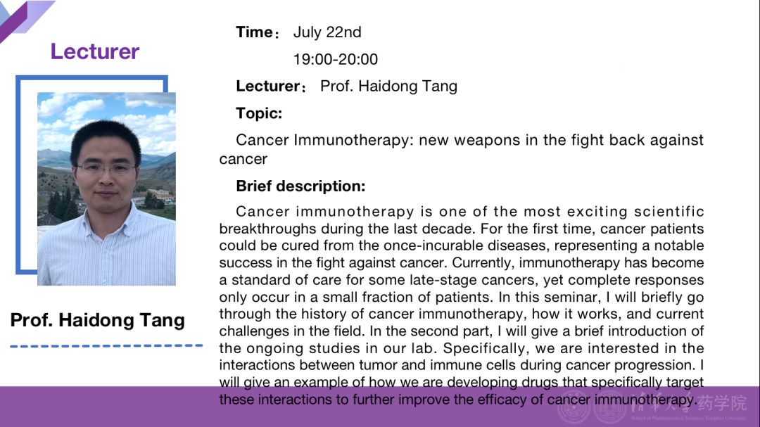 2021年疫情依然影響著線下項(xiàng)目的舉辦,“清華安進(jìn)學(xué)者”項(xiàng)目本著停課不停學(xué)的目標(biāo),在2021年的暑期連續(xù)為新老學(xué)員舉辦了三期線上講座,講座內(nèi)容豐富多彩“老學(xué)員回家-2019年清華安進(jìn)校友進(jìn)行項(xiàng)目經(jīng)驗(yàn)分享”“藥學(xué)院pi科研講座-清華大學(xué)藥學(xué)院李寅青教授、唐海東教授進(jìn)行線上專(zhuān)題講座”并與新老學(xué)員們進(jìn)行熱烈的討論和積極互動(dòng)。