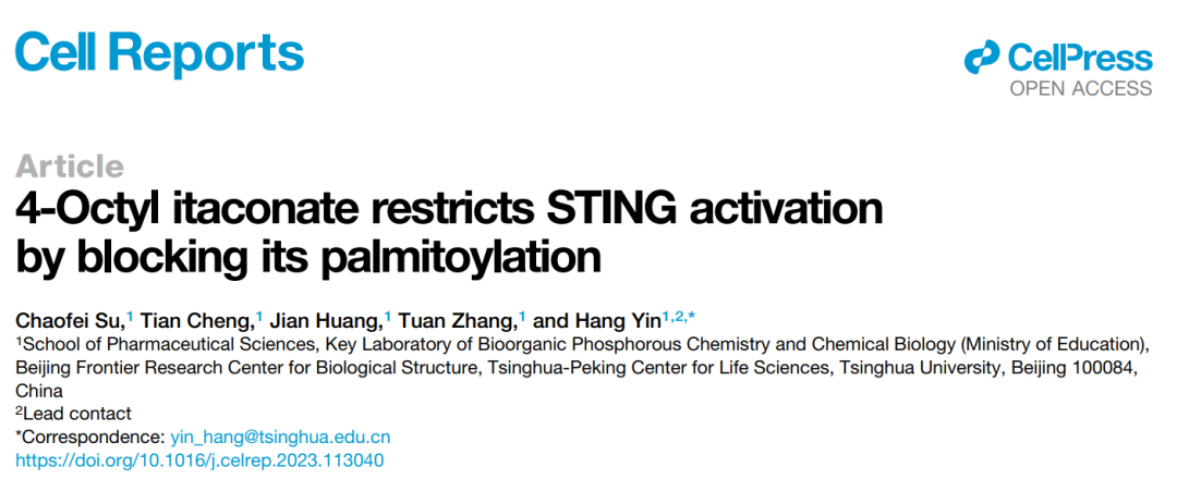2023年8月24日,清華大學藥學院尹航課題組在《Cell Reports》上發(fā)表了題為“4-Octyl itaconate restricts STING activation by blocking its palmitoylation”的研究文章。發(fā)現衣康酸的衍生物4-辛基衣康酸(4-Octyl itaconate, 4-OI)能夠直接烷基化修飾STING的Cys91,從而阻斷了STING Cys91位點的棕櫚化修飾,抑制了STING的寡聚和下游信號的激活。