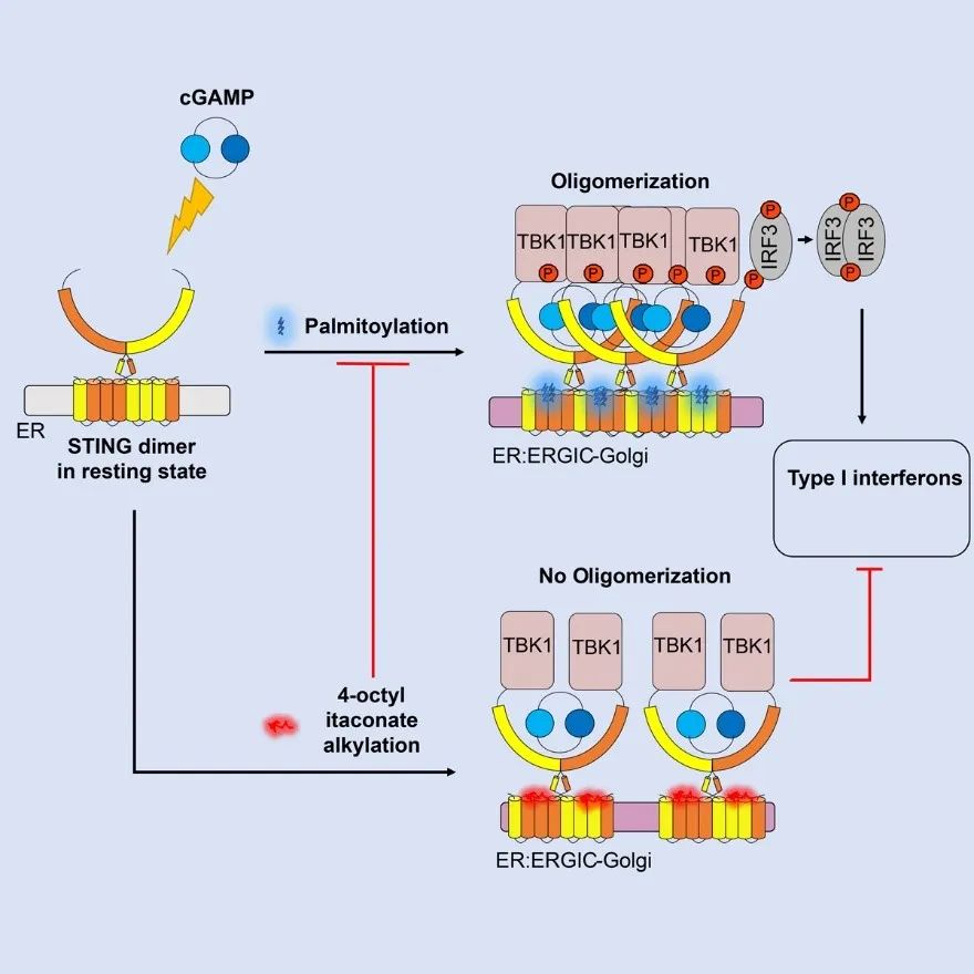總之,本研究發(fā)現衣康酸衍生物4-OI能夠通過烷基化修飾STING,抑制了STING的棕櫚酰化從而抑制了STING的激活,展現了STING不同翻譯后修飾之間存在相互影響(圖2)。同時本研究也表明4-OI能夠抑制cGAS-STING介導的免疫炎癥,或可為相關自身免疫疾病的治療提供新的策略。