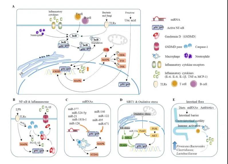 除此之外,活性氧,miRNAs、內(nèi)質(zhì)網(wǎng)應(yīng)激等,通過影響MAPK、巨噬細(xì)胞、SIRT1等影響炎癥因子的表達(dá)和釋放。