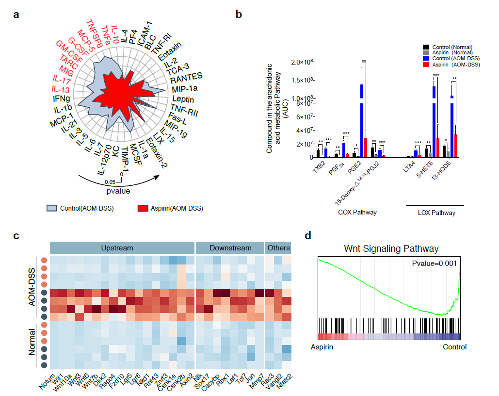 結(jié)果表明,阿司匹林可以顯著減少AOM/DSS小鼠結(jié)腸腫瘤數(shù)目,降低促炎因子分泌,抑制前列腺素類物質(zhì)生成。而轉(zhuǎn)錄組和蛋白質(zhì)組分析則進一步揭示了阿司匹林預防結(jié)直腸癌的分子機制可能與阿司匹林對Wnt通路的抑制作用密切相關。
