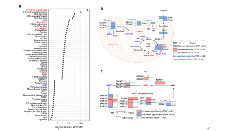 為了探究ZIKV感染所致小頭癥的分子機(jī)制和潛在治療靶點(diǎn),作者利用包括轉(zhuǎn)錄組學(xué),蛋白質(zhì)組學(xué),磷酸化蛋白質(zhì)組學(xué),以及代謝組學(xué)在內(nèi)的多組學(xué)技術(shù),全面描繪了ZIKV感染腦組織中的分子變化特征。轉(zhuǎn)錄組學(xué)和蛋白組學(xué)揭示了ZIKV感染腦組織引起了顯著的細(xì)胞凋亡和免疫反應(yīng)。蛋白組學(xué)揭示了ZIKV感染腦組織中膽固醇代謝上調(diào)和腦神經(jīng)發(fā)育障礙。進(jìn)一步,通過(guò)將代謝組學(xué)與其他組學(xué)在通路水平進(jìn)行多組學(xué)整合分析,作者從不同分子層面上交互驗(yàn)證了ZIKV感染導(dǎo)致小頭癥的發(fā)生過(guò)程中的一系列代謝重編程事件,如NAD+代謝,三羧酸循環(huán)(TCA cycle),氧化磷酸化(OXPHOS),嘌呤和嘧啶代謝等,同時(shí)也提示ZIKV感染可能導(dǎo)致線粒體功能發(fā)生障礙(圖1)。值得注意的是,ZIKV感染腦組織中NAD+水平急劇下降,而從頭合成和補(bǔ)救合成途徑上的前體(tryptophan、kynurenine、nicotinamide riboside、nicotinamide mononucleotide)水平均發(fā)生不同程度的上調(diào)(圖1)。因此推測(cè)NAD+代謝通路重編程可能是ZIKV感染所致小頭癥的關(guān)鍵節(jié)點(diǎn)和潛在干預(yù)靶標(biāo)。此外,磷酸化蛋白質(zhì)組學(xué)揭示了ZIKV感染腦組織中MAPK通路顯著激活,結(jié)合NAD+代謝以及相關(guān)蛋白變化,推測(cè)ZIKV感染可能存在MAPK-NMNAT2-NAD+軸的潛在分子機(jī)制。