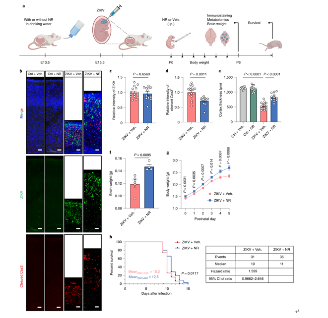 為了探究NAD+代謝重編程在ZIKV感染所致小頭癥中的功能,作者使用ZIKV感染小鼠所致小頭癥模型進(jìn)行體內(nèi)實(shí)驗(yàn),觀察回補(bǔ)NAD+及相關(guān)前體是否可以改善ZIKV感染所致的小頭癥。研究結(jié)果表明,腦注射NAD+可以顯著抑制ZIKV感染所致的細(xì)胞凋亡,增加大腦皮層厚度。而腹腔注射NAD+的重要前體nicotinamide riboside(NR)不僅可以顯著抑制ZIKV感染所致的細(xì)胞凋亡,增加大腦皮層厚度,還可以增加感染小鼠的體重和腦重,延長(zhǎng)其生存期(圖2)。