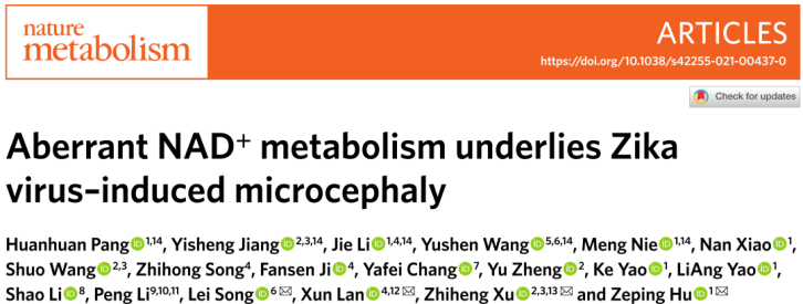 2021年8月12日,清華大學(xué)藥學(xué)院胡澤平課題組與合作者在《Nature Metabolism》雜志以研究長(zhǎng)文(Article)在線發(fā)表題為“Aberrant NAD+ metabolism underlies Zika virus-induced microcephaly” 的文章,揭示ZIKV感染導(dǎo)致小頭癥腦組織發(fā)生顯著的煙酰胺腺嘌呤二核苷酸(NAD+)代謝重編程;并發(fā)現(xiàn)靶向干預(yù)NAD+代謝可以在動(dòng)物模型中有效改善ZIKV感染所致的小頭癥。