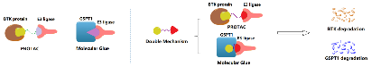 作者在之前的工作中實現(xiàn)了BTK野生型和突變型蛋白的高效降解,解決了臨床耐藥問題,但另一挑戰(zhàn)出現(xiàn)了,目前不論是BTK抑制劑還是PROTAC分子,對難治性的DLBCL及AML很難達到較好的治療效果,而為了突破這一難題,作者想到可利用另一靶點的同時降解來實現(xiàn),GSPT1是翻譯終止因子,協(xié)調完成體內蛋白的翻譯過程,而GSPT1的下調可使蛋白表達異常,進而抑制多種腫瘤細胞的增殖和生存。因此作者希望利用雙機制降解劑將GSPT1的降解引入到靶向BTK的PROTAC分子中,進而打破靶向BTK分子在淋巴瘤應用中的壁壘。