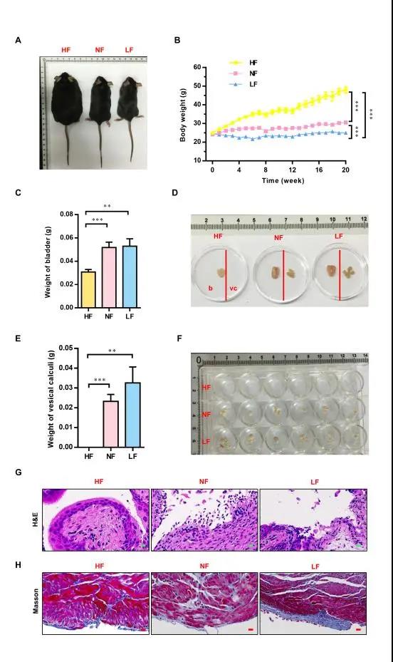 為了檢測脂肪成分對原發(fā)性膀胱結(jié)石形成的影響,作者分別用富脂飼料(HF)、正常飼料(NF)和低脂飼料(LF)喂養(yǎng)小鼠,進(jìn)行為期20周的飲食干預(yù)。