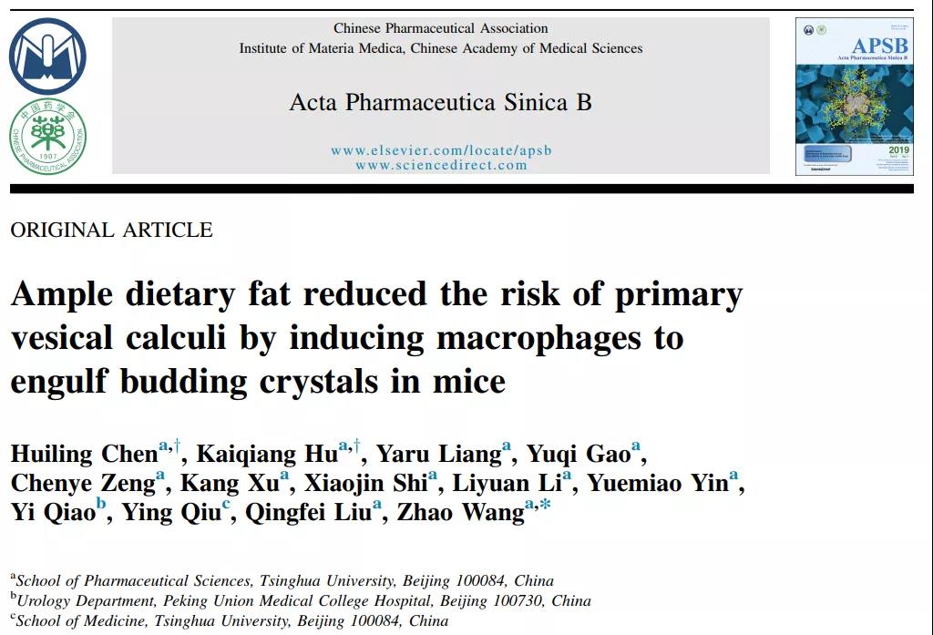 該研究于2021年9月8日在線發(fā)表于藥學(xué)領(lǐng)域知名學(xué)術(shù)期刊《Acta Pharmaceutica Sinica B》(APSB),論文標(biāo)題為“Ample dietary fat reduced the risk of primary vesical calculi by inducing macrophages to engulf budding crystals in mice”。