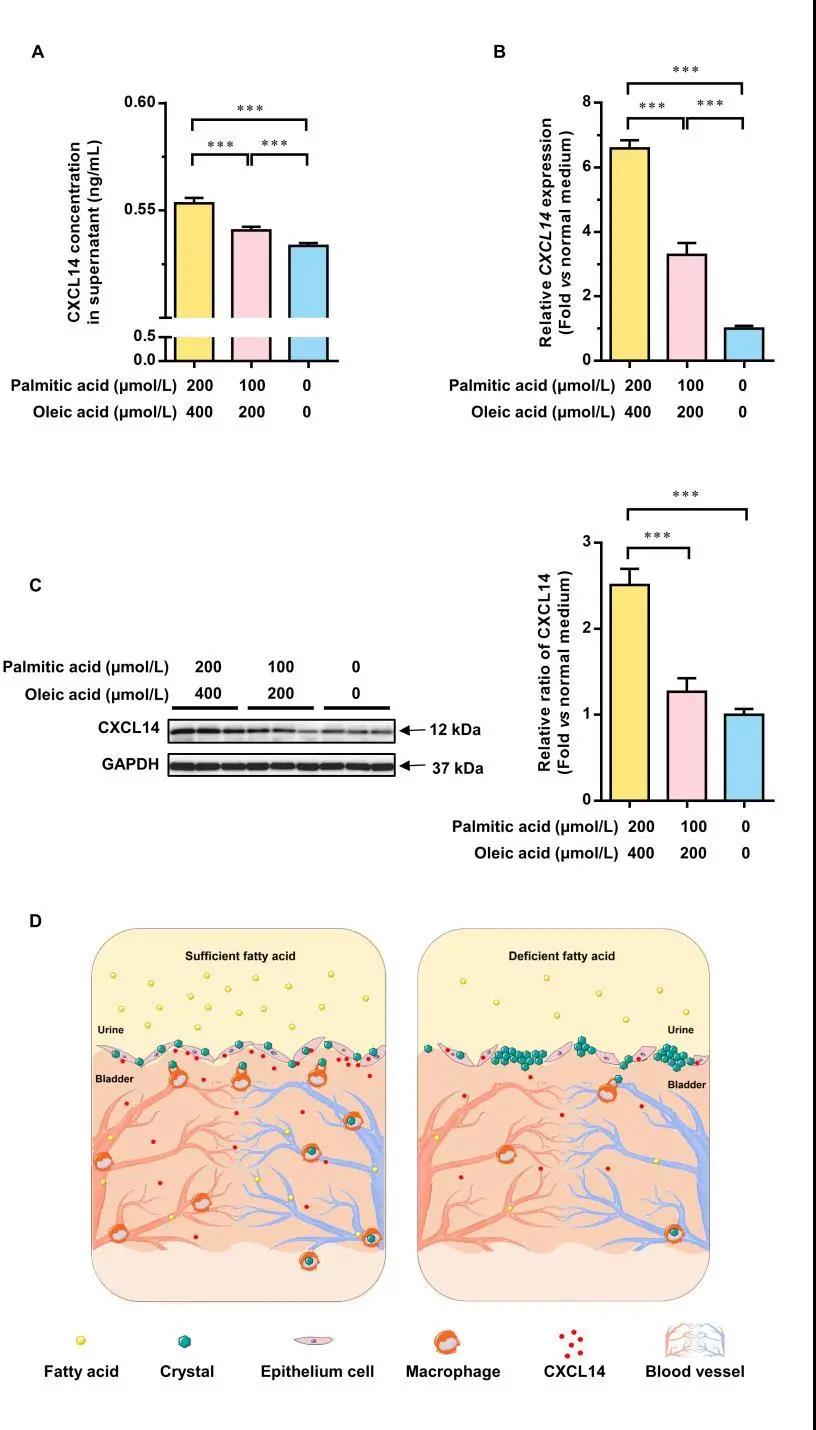 為了進(jìn)一步驗(yàn)證脂肪酸的作用,作者在體外培養(yǎng)了人膀胱上皮HCV-29細(xì)胞,通過向HCV-29細(xì)胞培養(yǎng)基中添加不同濃度的游離脂肪酸,然后測定細(xì)胞和培養(yǎng)基上清中CXCL14的表達(dá)情況。