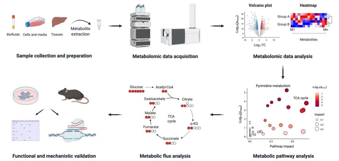 代謝組學(xué)分析主要分為三步驟:樣品制備、數(shù)據(jù)采集、和數(shù)據(jù)處理分析與生物學(xué)意義闡釋。生物樣本經(jīng)過提取處理后,通過色譜-質(zhì)譜(mass spectrometry, MS)聯(lián)用或核磁共振(nuclear magnetic resonance, NMR)來對代謝物進行分析和數(shù)據(jù)采集。簡要數(shù)據(jù)處理則主要包括通過火山圖和熱圖呈現(xiàn)代謝物的豐度和倍數(shù)變化,對代謝物進行通路富集分析。后續(xù)則可選擇使用同位素標記的代謝流分析來揭示代謝通路的動態(tài)變化,并使用體外或者體內(nèi)模型來進行代謝重塑的功能和機制驗證。近年來的代謝組學(xué)技術(shù)取得一些重要進展,如胡澤平課題組發(fā)展的可用于極微量樣本(如1,000-5,000個造血干細胞或者60個卵母細胞)的超靈敏代謝組學(xué)技術(shù)和Sabatini課題組發(fā)展的線粒體代謝組學(xué)等,都推動了代謝組學(xué)在代謝生物學(xué)和腫瘤生物學(xué)中的應(yīng)用。