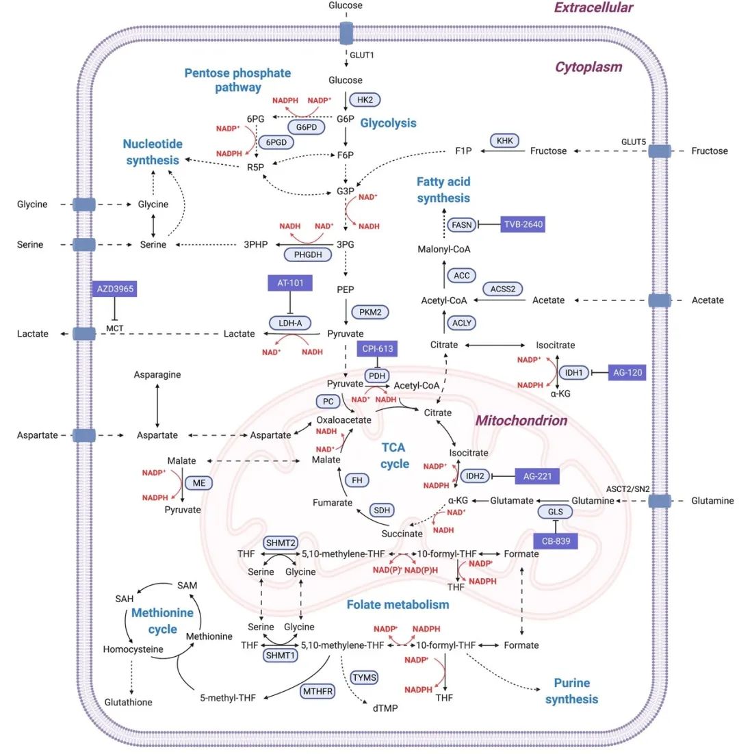 圖3. 促進腫瘤細胞生長的代謝通路及潛在治療靶點