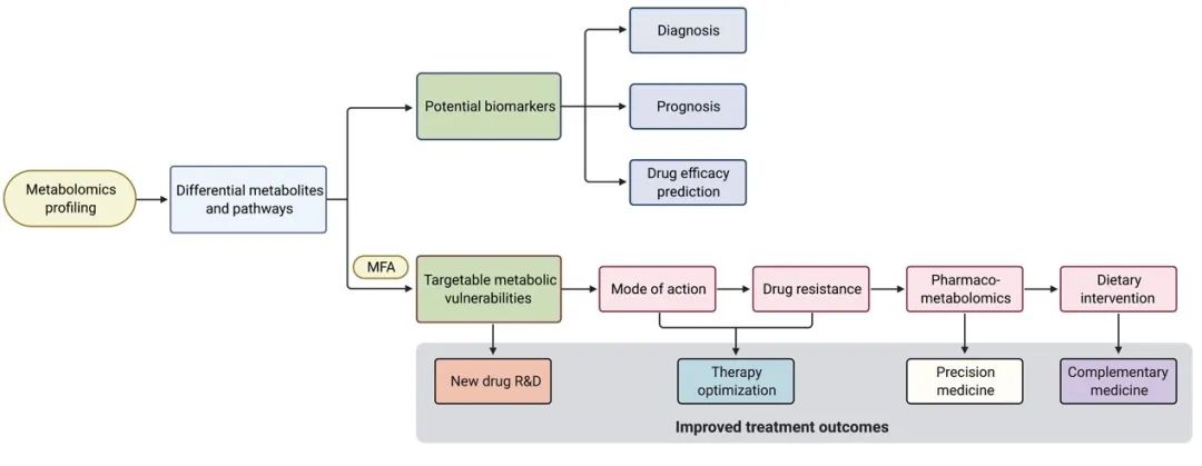 經(jīng)過代謝組學(xué)分析后,差異代謝物和代謝通路可引導(dǎo)發(fā)現(xiàn)潛在的生物標記物和可靶向的代謝依賴性和弱點。潛在的生物標記物可幫助腫瘤的早期診斷、預(yù)后和藥物有效性預(yù)測。通過結(jié)合代謝流分析,代謝靶標可以幫助新藥研發(fā),或者是幫助科研人員更好地理解現(xiàn)有藥物的作用機制,以及如何產(chǎn)生耐藥,從而改善現(xiàn)有療法。藥理代謝組學(xué)可以用于指導(dǎo)精準治療;飲食干預(yù)療法則可以作為藥物治療的輔助手段。