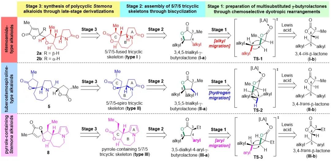 在此項研究中,唐葉峰課題組結(jié)合前期研究工作基礎(chǔ)以及百部生物堿的骨架特點,提出了“通過化學(xué)選擇性β-環(huán)丙內(nèi)酯dyotropic重排反應(yīng)實現(xiàn)不同類型百部生物堿的量體裁衣式合成”這一設(shè)計思想(圖2)。該合成策略的核心在于通過控制底物β-環(huán)丙內(nèi)酯C3和C4位取代基的立體位阻效應(yīng)和C5位取代基的電子效應(yīng),精確調(diào)控C5位取代基的遷移順序,進(jìn)而通過化學(xué)選擇性的烷基遷移、氫遷移和芳基遷移得到5/7/5并環(huán)、5/7/5螺環(huán)和含芳香吡咯環(huán)的5/7/5并環(huán)等三種不同百部生物堿核心骨架。在此基礎(chǔ)上,通過對上述三環(huán)骨架中A環(huán)和C環(huán)分別進(jìn)行后期衍生化,完成了一系列結(jié)構(gòu)更為復(fù)雜的四環(huán)百部生物堿的全合成。在此項工作中,唐葉峰課題組共實現(xiàn)三種亞型、6個百部生物堿的不對稱合成,且所有目標(biāo)分子的最長線性步驟不超過12步,體現(xiàn)出合成策略的高效性、普適性和多樣性。