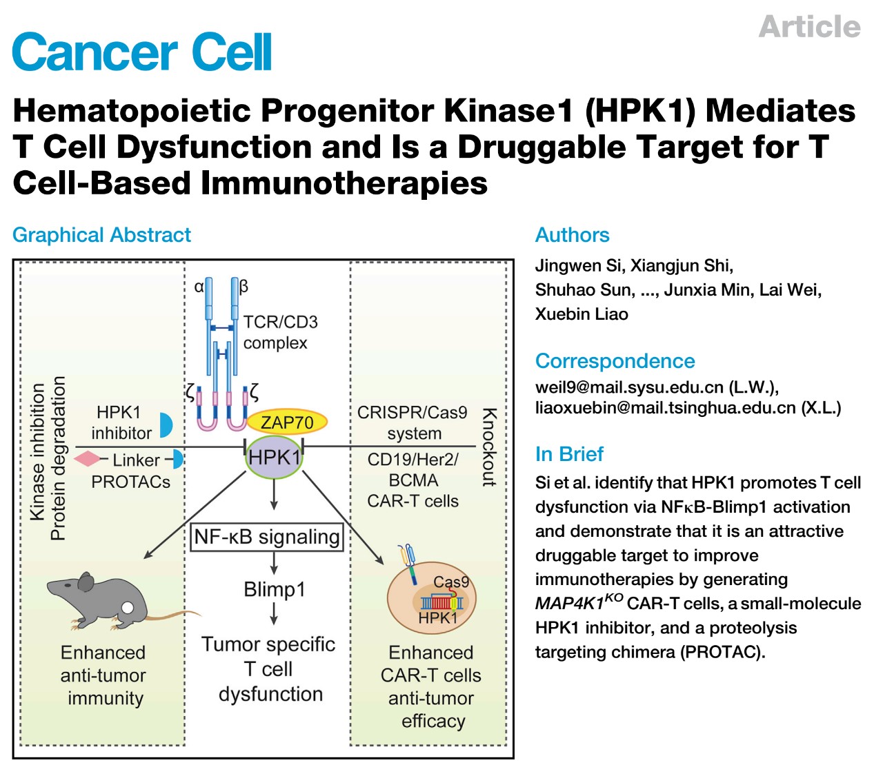 華大學(xué)藥學(xué)院廖學(xué)斌課題組與中山大學(xué)魏來課題組合作在《Cancer Cell》雜志上發(fā)表文章“造血祖細(xì)胞激酶1 (HPK1)通過有效調(diào)控T細(xì)胞功能,成為T細(xì)胞免疫治療的藥物靶點(diǎn)(Hematopoietic Progenitor Kinase1 (HPK1) Mediates T Cell Dysfunction and Is a Druggable Target for T Cell-Based Immunotherapies)”,該工作證實(shí)了造血祖細(xì)胞激酶1可成為T細(xì)胞免疫療法的藥物熱門研發(fā)靶點(diǎn)。