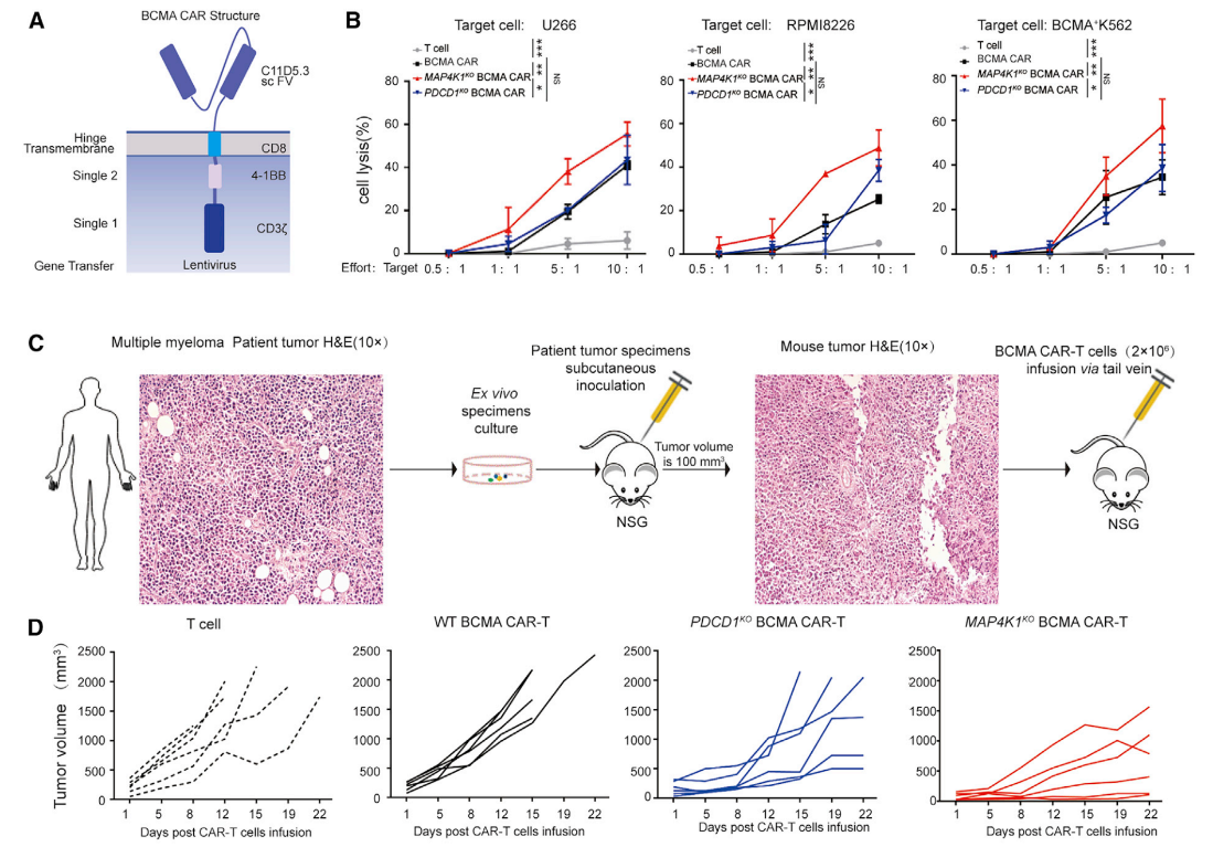 A.BCMA CAR的結(jié)構(gòu)示意圖;B.BCMA CAR-T細(xì)胞體外殺傷力檢測(cè);C. 人源多發(fā)性骨髓瘤異種移植模型(Patient-Derived tumor Xenograft,PDX)構(gòu)建示意圖;D. BCMA CAR-T細(xì)胞小鼠體內(nèi)抗腫瘤效應(yīng)。
