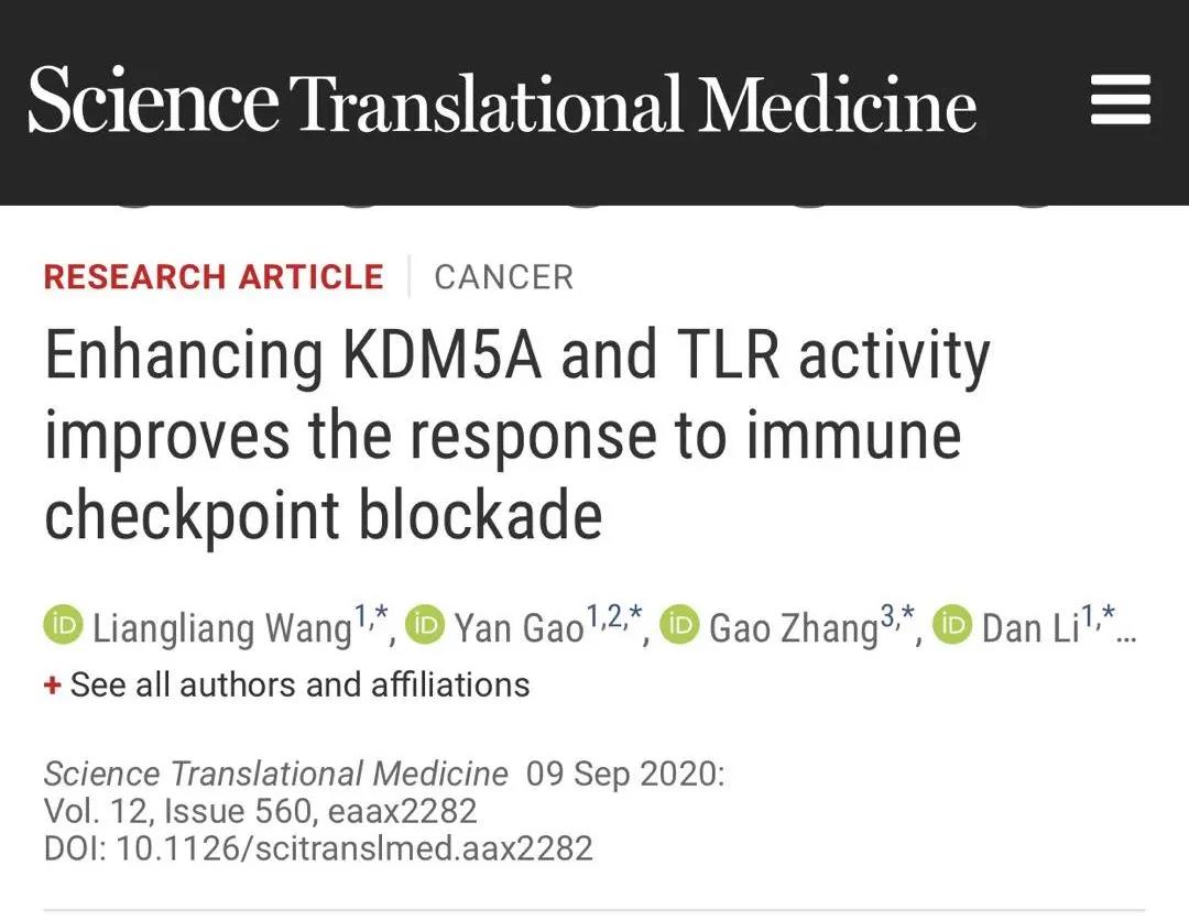 2020年9月9日清華大學(xué)藥學(xué)院廖學(xué)斌課題組及其合作團隊在《Science Translational Medicine》雜志上在線發(fā)表了題為“增強KDM5A和TLR活性可有效提高免疫檢查點阻斷劑的治療效果(Enhancing KDM5A and TLR activity improves the response to immune checkpoint blockade)”的研究論文,該工作證實了KDM5A激活與PD-(L) 1阻斷聯(lián)合可作為一種新的癌癥治療策略。