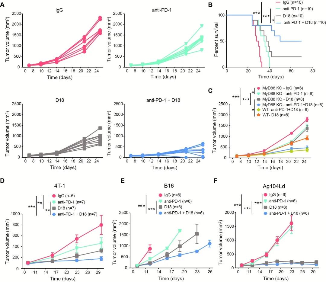 A-F. D18與anti-PD-1聯(lián)合用藥在小鼠腫瘤模型(MC38,4T-1,B16和Ag104Ld)中的治療效果