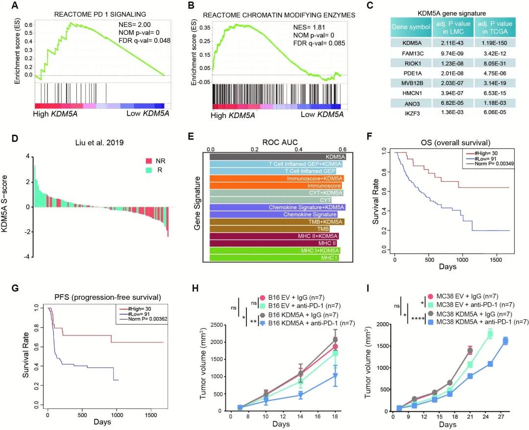 研究團隊首先證明了KDM5A gene signature與接受PD-(L) 1治療的黑色素瘤患者的生存期的呈正相關(guān)性。作者通過分析已有的RNA-seq數(shù)據(jù)(黑色素瘤樣本),定義了一個8基因的KDM5A gene signature,并以此預(yù)測分析黑色素瘤病人對PD-1治療的反應(yīng)效果。分析發(fā)現(xiàn),KDM5A的表達(dá)與接受PD-1治療的腫瘤患者的生存率呈正相關(guān),且KDM5A gene signature可以作為免疫治療的一個有效的biomarker。作者嘗試將腫瘤細(xì)胞進行KDM5A過表達(dá),并聯(lián)合PD-1抗體治療,結(jié)果發(fā)現(xiàn)治療的效果良好,在小鼠模型上得到了進一步的驗證。