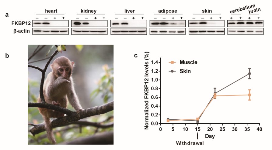 圖2. 利用所設計PROTAC對恒河猴FKBP12全身敲低及停藥后蛋白恢復