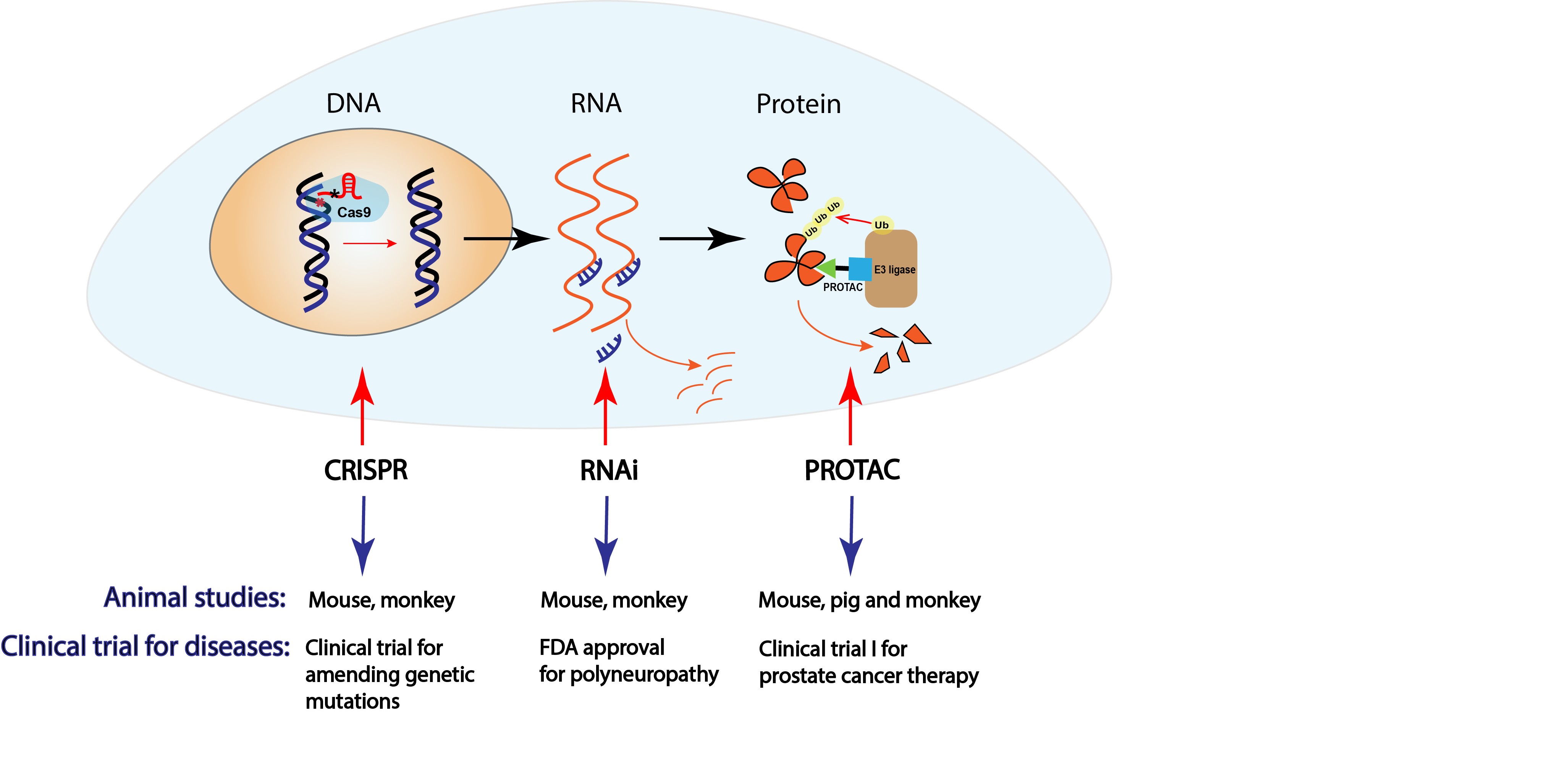動物的基因敲除是常見的研究手段之一。目前,常見的敲除手段如TALEN,Cre-LoxP,CRISPR-Cas9等是從基因組進行敲除,RNA干擾的方式則是從轉錄水平進行敲降。而這些方法通常在構建大動物基因敲除模型,尤其是非人靈長類上仍存在很大難度。此外,這些方法構建模型通常需要較長時間,且基因敲除引起的功能喪失多是不可逆的。而且基因敲除模型中潛在的基因補償和/或自發(fā)突變可能導致功能誤讀。某些特定基因的全身性敲除會出現(xiàn)胚胎發(fā)育異常甚至死亡的現(xiàn)象,影響出生后的實驗研究。
