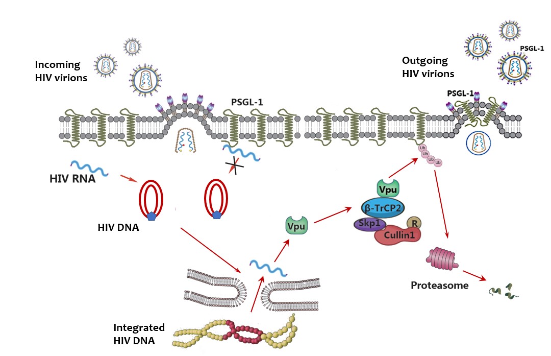 示意圖:PSGL-1可以抑制病毒RNA逆轉(zhuǎn)錄合成DNA(1) ,也能被包裝到新的病毒顆粒中,抑制其新一輪的感染(2)。病毒通過其附屬蛋白Vpu結(jié)合PSGL-1并介導(dǎo)泛素連接酶SCF-βTrCP2泛素化PSGL-1,導(dǎo)致PSGL-1被蛋白酶體(proteasome)降解,從而逃逸PSGL-1對新生病毒感染的強(qiáng)烈抑制作用。