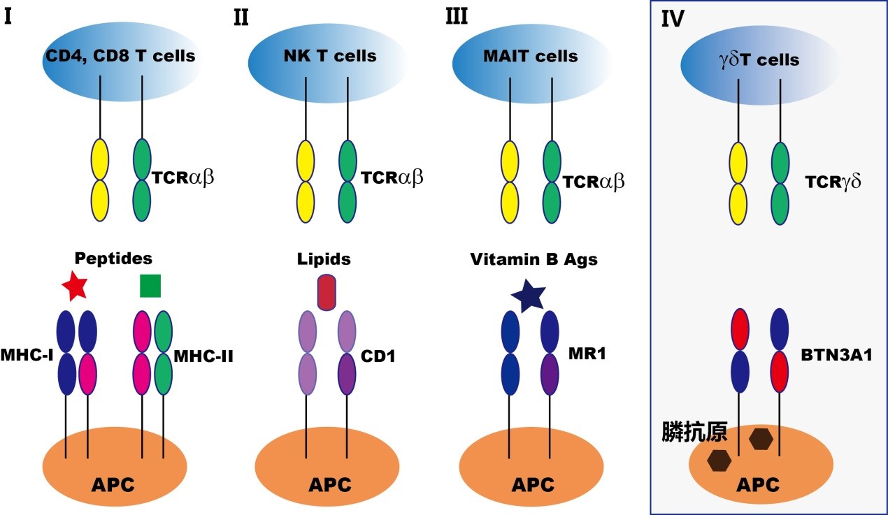 圖3:T細(xì)胞抗原識(shí)別模式,前三種都屬于αβ T細(xì)胞。第四種為γδ T細(xì)胞。