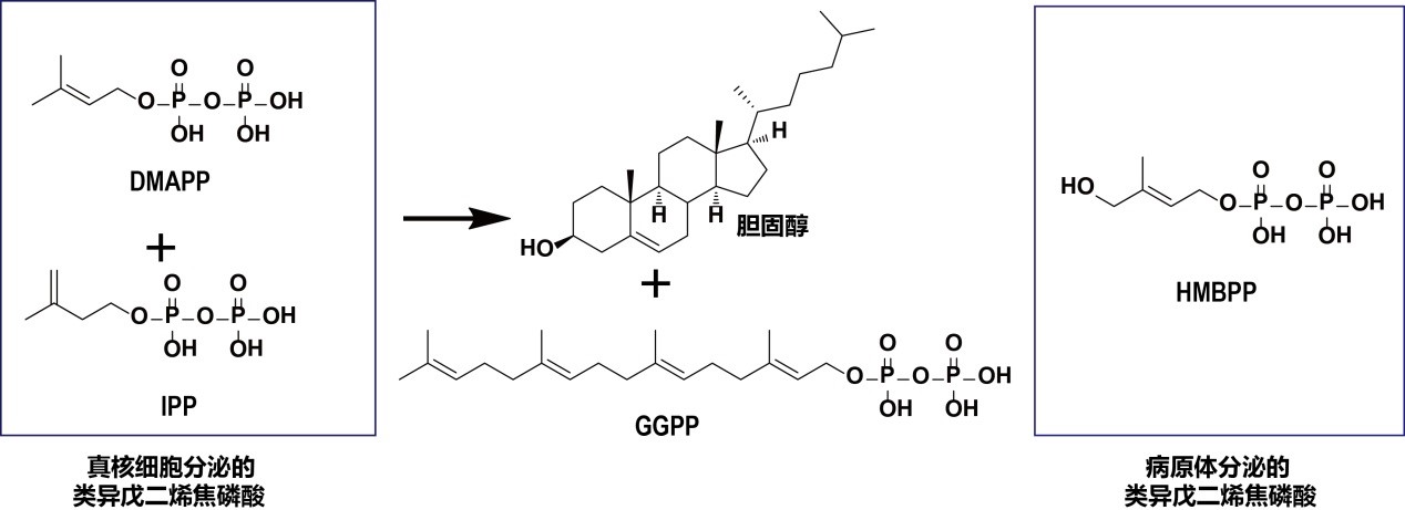 圖1:各種類異戊二烯焦磷酸的化學(xué)結(jié)構(gòu),其中DMAPP, IPP是合成膽固醇及GGPP的起始底物,而GGPP可以調(diào)控αβ T細(xì)胞對(duì)抗原的識(shí)別;HMBPP則是目前γδ T細(xì)胞刺激活性最強(qiáng)的膦抗原。