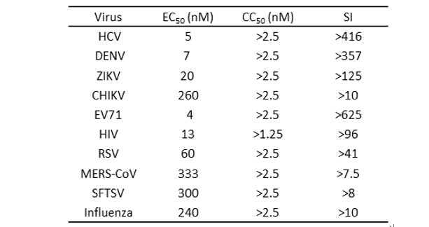 J. Med. Chem. 2017, 60 (5), 1994-2005),在第一輪篩選中僅從不到200個(gè)化合物中就確認(rèn)得到了5個(gè)苗頭化合物,然后經(jīng)過一系列的構(gòu)效關(guān)系研究和優(yōu)化得到一個(gè)活性最強(qiáng)的分子RYL-634(圖1)。這也是喹諾酮類化合物在藥物發(fā)現(xiàn)中作為一種優(yōu)勢(shì)結(jié)構(gòu)的體現(xiàn)。進(jìn)一步的研究發(fā)現(xiàn),RYL-634對(duì)包括丙肝病毒(HCV)、DENV、ZIKV、基孔肯雅病毒(CHIKV)、腸道病毒EV71、人免疫缺陷病毒(HIV)、呼吸道合胞病毒(RSV)、中東呼吸綜合癥冠狀病毒(MERS-CoV)、發(fā)熱伴血小板減少綜合征病毒(SFTSV)、流感病毒等對(duì)人致病病毒具有很強(qiáng)或較明顯的抑制效果,對(duì)宿主細(xì)胞的毒性也在可接受范圍內(nèi)(表1)。RYL-634還與目前批準(zhǔn)的抗病毒藥物聯(lián)用具有協(xié)同效應(yīng)。經(jīng)過耐藥壓力篩選,未發(fā)現(xiàn)對(duì)RYL-634耐藥的病毒株產(chǎn)生。以上結(jié)果顯示了基于RYL-634發(fā)展新型抗病毒治療方法具有很大的潛力。