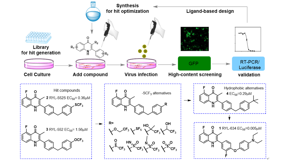 基于目前的這種抗病毒現(xiàn)狀,饒燏課題組與婁智勇課題組合作,利用之前在發(fā)展抗瘧疾NDH2抑制劑過程中構(gòu)建的一類2-位二芳基取代的喹諾酮類化合物作為基于表型的篩選對(duì)象(