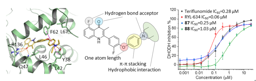 最終,研究人員通過一系列生化實(shí)驗(yàn)、Drug Affinity Responsive Target Stability (DARTS)等方法確定了人的DHODH是RYL-634的一個(gè)抗病毒靶點(diǎn)(圖3)。DHODH還是抗癌、免疫調(diào)節(jié)、抗瘧疾等方向的靶點(diǎn),RYL-634作為一類新的DHODH抑制劑,有希望被應(yīng)用的以上領(lǐng)域。特別是對(duì)于抗瘧疾,由于該類化合物最初被用作瘧原蟲的NDH2抑制劑,而人源DHODH與瘧原蟲的DHODH又具有一定同源性,在未來有極大可能性基于該類化合物發(fā)展出針對(duì)瘧原蟲NDH2和DHODH的雙重抑制劑,以克服目前瘧疾的耐藥問題。除了DHODH,研究人員并不排除RYL-634可能通過其它途徑發(fā)揮抗病毒作用,對(duì)于其作用機(jī)制的進(jìn)一步研究和類藥性質(zhì)的優(yōu)化還在進(jìn)行中。