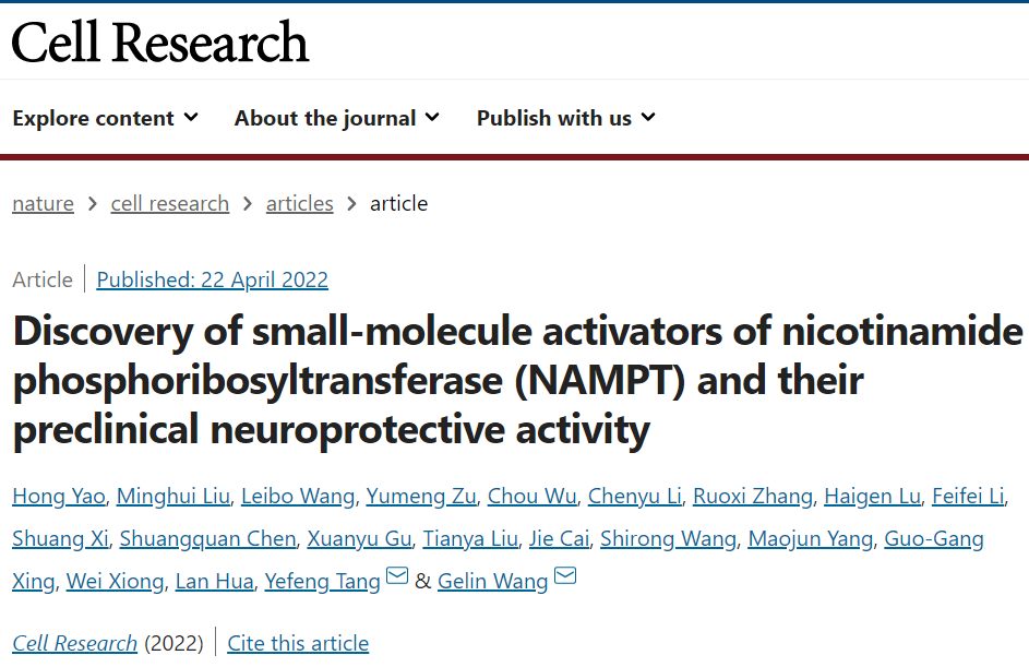 上述研究在Cell Research (CR) 和European Journal of Medicinal Chemistry (EJMC) 雜志上相繼發(fā)表標(biāo)題為 “Discovery of small-molecule activators of nicotinamide phosphoribosyltransferase (NAMPT) and their preclinical neuroprotective activity”和“Optimization of NAMPT Activators to Achieve in vivo Neuroprotective Efficacy”的兩篇研究論文。