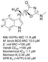 天然產(chǎn)物吲哚霉素對(duì)慢生長(zhǎng)非結(jié)核分枝桿菌的MIC約為4μg/ml;只抑制少數(shù)病原菌生長(zhǎng),對(duì)革蘭氏陰性菌和大部分腸道細(xì)菌沒(méi)有作用;在10倍MIC濃度下對(duì)動(dòng)物細(xì)胞沒(méi)有毒性。它的生化和物理化學(xué)指標(biāo)均達(dá)到了做藥物先導(dǎo)化合物的要求。