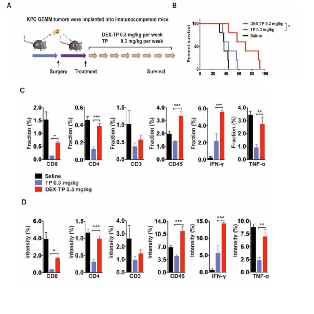 作為藥物分子,雷公藤甲素的不良作用之一是對白細胞的抑制作用,TP作為一種免疫抑制因子,已在中藥中應用于自身免疫性疾病的治療數(shù)百年。然而,癌癥治療正傾向于利用免疫系統(tǒng)來對抗腫瘤的進展。由于葡聚糖被證明可以提高TP的癌細胞選擇性,作者想知道這些偶聯(lián)物是否會以一種更有利于免疫系統(tǒng)的方式表現(xiàn)出來。在實驗中作者采用免疫活性KPC異體移植小鼠模型來研究DEX-TP對腫瘤微環(huán)境的影響(圖4A)。KPC同種異體移植瘤具有一些臨床相關的病理特性,如明顯纖維化和多成分組成。葡聚糖偶聯(lián)藥物組治療后的總生存率高于游離藥物治療(圖4B)。