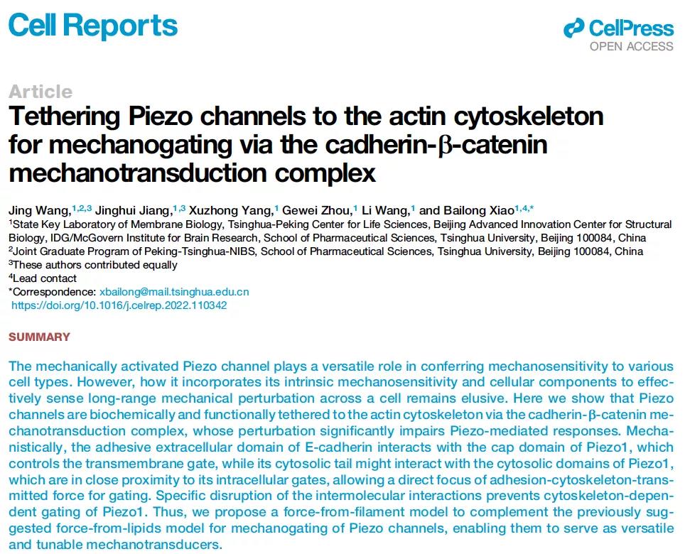 Cell Reports期刊發(fā)表了題為“Tethering Piezo channels to the actin cytoskeleton for mechanogating via the cadherin-β-catenin mechanotransduction complex”的研究長文,報導了Piezo離子通道通過cadherin-β-catenin機械傳感復合物與F-actin建立生化與功能連接, 提出了Piezo通道以細胞微絲骨架為結(jié)構(gòu)基礎的栓繩拉力模型,推動了對Piezo通道的機械力感知分子機制的理解。