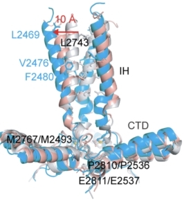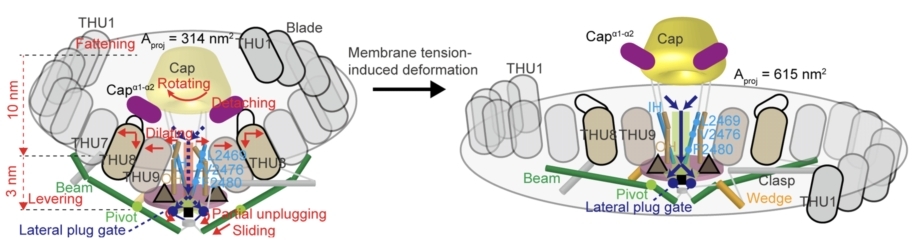 ? 展平的槳葉帶動胞內(nèi)側(cè)的Beam發(fā)生杠桿運動,把形變傳遞到孔道區(qū)胞內(nèi)側(cè),可能通過門閂-拴鎖機制,打開三個側(cè)向出口閘門(Lateral plug gate),讓離子流入細(xì)胞 。