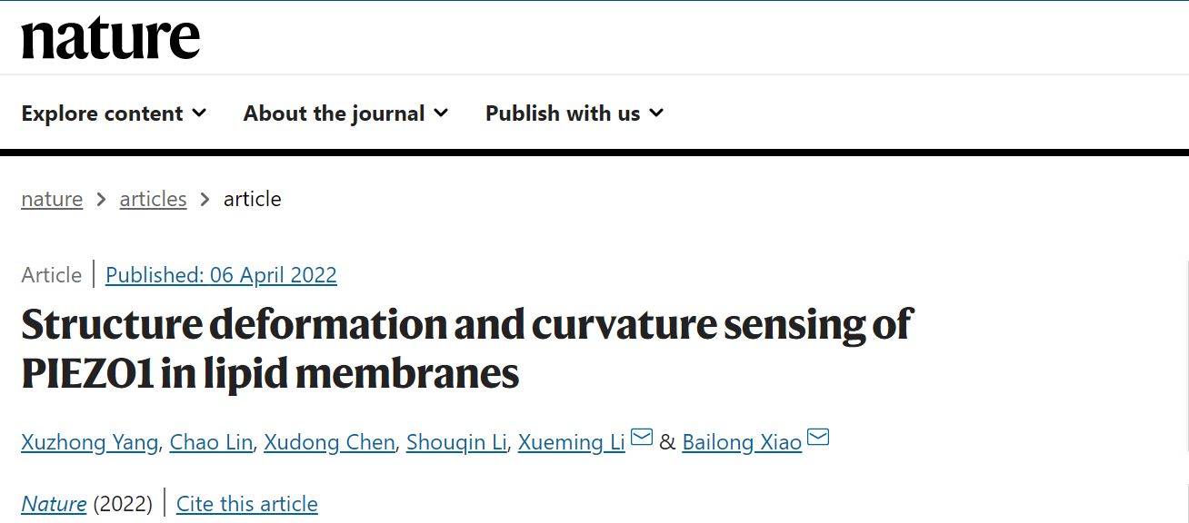 以上論文于2022年4月6日在《自然》期刊在線刊登,標(biāo)題為《PIEZO1在脂膜中的結(jié)構(gòu)形變與曲率感知》(Structure deformation and curvature sensing of PIEZO1 in lipid membranes)。