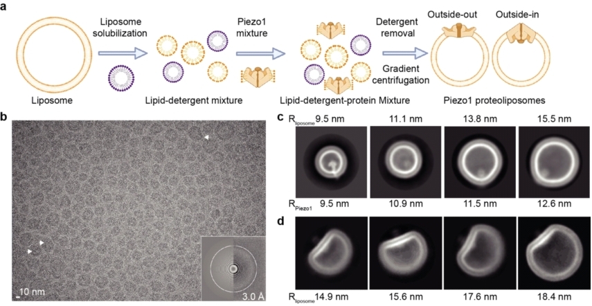 PIEZO1本身的曲率半徑接近10 nm,其主要以outside-in的方式重組到脂質(zhì)體中。在同等大小的脂質(zhì)體中時,曲率相符呈圓形。當(dāng)它重組進(jìn)更大的脂質(zhì)體中時,曲率半徑的差異在兩者間產(chǎn)生力,蛋白和膜發(fā)生形變,呈水滴狀(圖4c)。