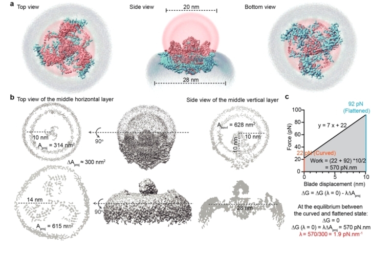 ? PIEZO1的受力形變:Piezo1在受力展平過程中,其末端有10 nm的向下位移、所占膜面積擴張了300 nm