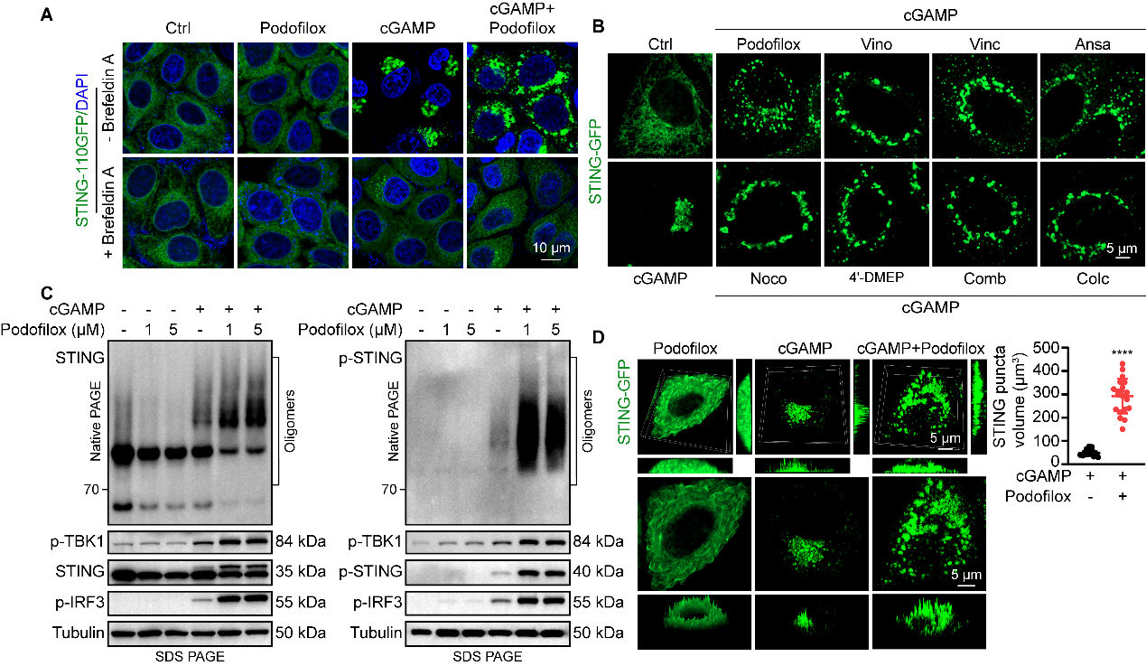 圖4. Podofilox增加STING puncta數(shù)量,持續(xù)增強(qiáng)cGAMP-STING信號通路