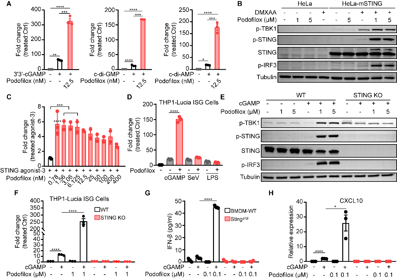 接下來,該研究團(tuán)隊(duì)探究Podofilox對不同STING激動劑(CDNs、DMXAA、STING-agonist-3)介導(dǎo)天然免疫反應(yīng)的作用。此外,為了判定Podofilox對cGAMP-STING通路作用的特異性,研究者通過基因敲除(STING KO),小分子或仙臺病毒(SeV)等(LPS誘導(dǎo)TLR通路激活;Poly(I:C)和SeV誘導(dǎo)RNA通路激活)誘導(dǎo)不同天然免疫通路的激活,進(jìn)一步確定Podofilox能特異性增強(qiáng)STING信號級聯(lián),并顯著促進(jìn)I型干擾素產(chǎn)生和ISGs基因表達(dá)(圖2)。