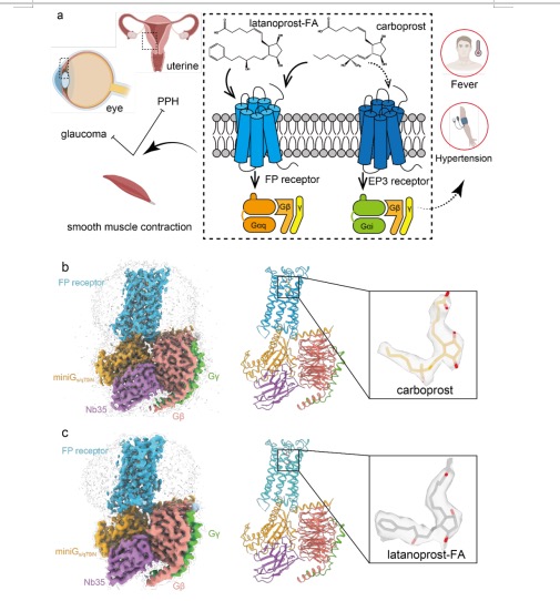 a, FP受體的功能以及FP受體高選擇性激動(dòng)劑拉坦前列素和低選擇性激動(dòng)劑卡前列素的病理生理作用; b-c, 卡前列素(b)和拉坦前列素(c)結(jié)合FP-miniGs/q70iN復(fù)合物的冷凍電鏡整體結(jié)構(gòu)圖。