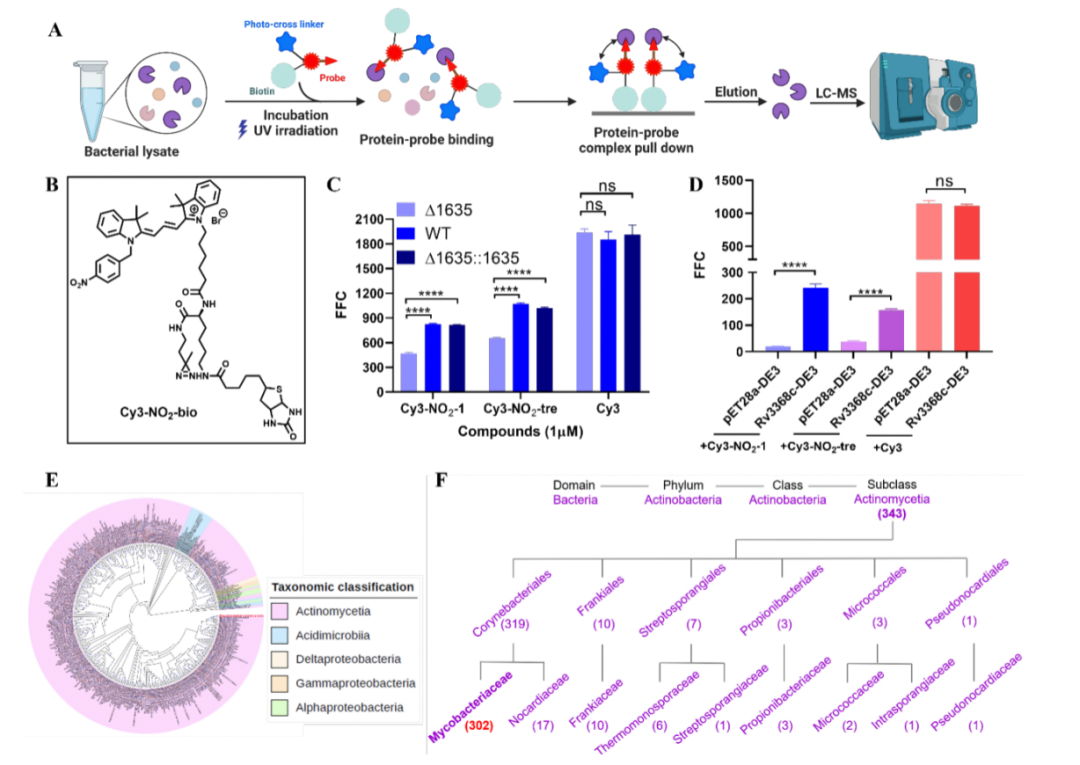 本研究設(shè)計(jì)合成了一系列的花菁類熒光探針,并確定熒光強(qiáng)度最高的Cy3-NO2-tre為最終熒光試劑。Cy3-NO2-tre自身不發(fā)光,但在細(xì)菌內(nèi)可被特異的硝基還原酶Rv3368c還原后開啟熒光。Cy3-NO2-tre可以選擇性標(biāo)記不同種屬混合菌中的Mtb,而不會(huì)對(duì)其他的細(xì)菌產(chǎn)生熒光標(biāo)記 (圖1)。課題組采用Pull down 實(shí)驗(yàn)技術(shù)鑒定了Cy3-NO2-tre作用靶點(diǎn)—Rv3368c,并通過(guò)比較Cy3-NO2-tre在Rv3368c基因敲除、回補(bǔ)分枝桿菌菌株內(nèi)、過(guò)表達(dá)Rv3368c大腸桿菌DE3的熒光強(qiáng)度得到驗(yàn)證 (圖2)。基于NCBI的生物信息學(xué)分析結(jié)果表明,Rv3368c主要表達(dá)于結(jié)核分枝桿菌科。