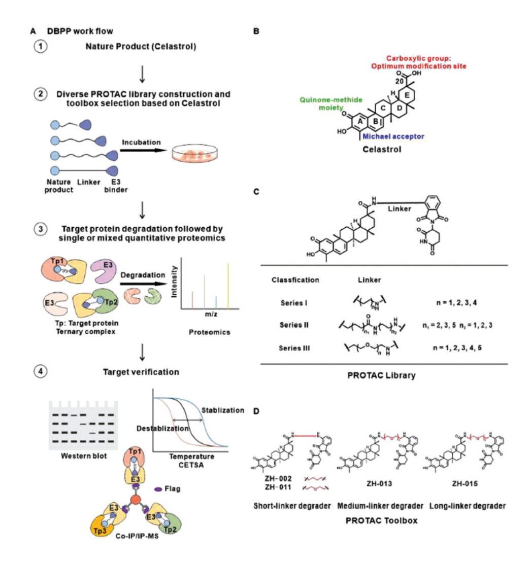 目前最為主流的靶點鑒定策略是基于活性的蛋白質分析(Activity-Based Protein Profiling,ABPP)。該策略的原理是先通過小分子與靶蛋白之間形成共價鍵,隨后通過linker引入報告基團如熒光基團或biotin,再通過凝膠熒光成像或biotin富集后的定量蛋白質組學來進行靶點鑒定。對于非共價小分子,ABPP需要外源引入光交聯基團來實現共價交聯。盡管該技術目前已被廣泛應用于小分子藥物的靶點鑒定,但它仍存在一些局限性。其高度依賴于小分子與靶蛋白之間的結合力,因此需要形成穩(wěn)定的共價相互作用,而光交聯基團的引入條件較為苛刻,且會產生大量的非特異性結合并對組學結果的分析造成一定的干擾。目前尚缺少一種基于非共價結合的靶點鑒定策略,而PROTAC技術的出現有望填補該空白。PROTAC的本質是小分子誘導的蛋白質互作,其不完全依賴于小分子與靶蛋白之間的結合力,理論上,弱結合靶蛋白通過PROTAC技術也能夠實現高效的降解。