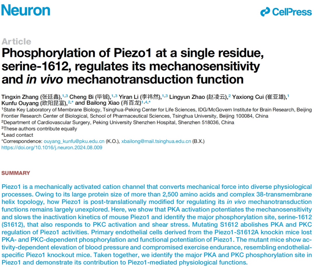 2024年9月12日,清華大學(xué)藥學(xué)院肖百龍教授課題組在神經(jīng)科學(xué)領(lǐng)域權(quán)威學(xué)術(shù)期刊《神經(jīng)元》(Neuron)雜志上在線刊登了題為《Piezo1的1612位絲氨酸磷酸化調(diào)控其機(jī)械敏感性和體內(nèi)機(jī)械傳導(dǎo)功能》(Phosphorylation of Piezo1 at a single residue, serine-1612, regulates its mechanosensitivity and in vivo mechanotransduction function)的研究論文,鑒定發(fā)現(xiàn)了機(jī)械門控Piezo1離子通道中1612位絲氨酸(S1612)為響應(yīng)蛋白激酶PKA和PKC的磷酸化位點(diǎn),揭示了磷酸化對Piezo1的機(jī)械敏感性的關(guān)鍵調(diào)節(jié)作用以及對血壓和運(yùn)動耐力等生理活動的重要影響。該研究成果不僅豐富了對Piezo1調(diào)節(jié)機(jī)制的理解,也為Piezo1在血管功能調(diào)節(jié)中的潛在應(yīng)用和相關(guān)疾病的治療策略開發(fā)奠定了基礎(chǔ)。